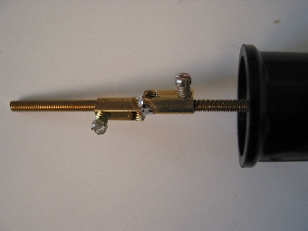 Die Grundidee ist nicht neu: Eine Messinggewindestange wird in eine Luftspule geschoben, deren Induktivität sich dadurch verringert. Das Problem dabei ist die Präzision der Lagerung und des Vorschubs der Gewindestange. Versuche, sie durch Muttern zu führen, verliefen bei mir nicht zufriedenstellend. Aber es geht einfacher und präziser! Zur Lagerung werden zwei Messinginnenteile von Lüsterklemmen verwendet, die hintereinander gelötet werden. Verwendet man Lüsterklemmen mit 3mm-Loch, so hat eine 3mm-Gewindestange ein wenig seitliches Spiel. Dieses Spiel kann man eliminieren, indem man die ursprünglichen Schrauben der Lüsterklemme durch 3mm-Plastikschrauben ersetzt, die man gefühlvoll bis zur Gewindestange anzieht. Wenn man die beiden Lüsterklemmen beim Verlöten um 90 Grad gegeneinander verdreht, so läßt sich das Spiel in jeder Richtung verhindern.