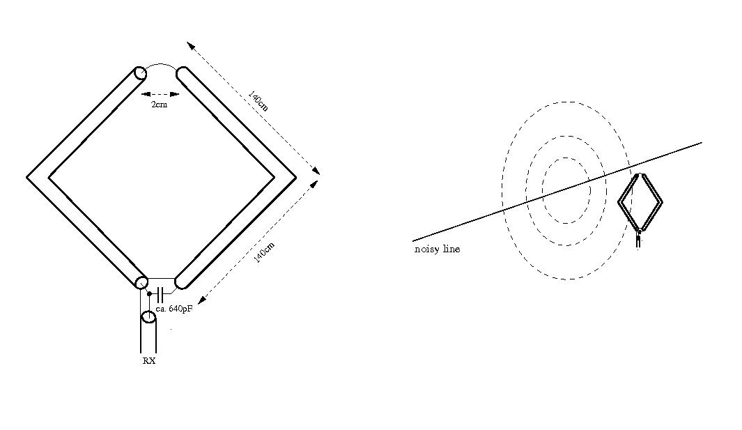 Abhilfe schaffte eine altbekannte Loopantenne aus Koaxkabel (oft K9FD zugeschrieben), die auf die Ortsrundenfrequenz abgestimmt wurde. Platziert man sie sehr genau senkrecht zu der Störleitung, so lässt sich der Störpegel nahezu auf S0 vermindern. Allerdings muss die Loop dafür sehr nahe an der Störleitung sein (1m-2m). In etwas größerer Entfernung lässt sich der Störpegel durch Drehen der Loop nicht mehr ganz auf Null bringen; die magnetischen Feldlinien der Störung verlaufen dann vermutlich schon nicht mehr in Ebenen senkrecht zur Leitung. Der Abgleich auf die Ortsrundenfrequenz erfolgte durch Festkondensatoren mit Hilfe des Mini-VNA . Es ließe sich aber auch ein Drehko einsetzen. Die Bandbreite ist sehr gering. Die Ausgangsspannung der Loop ist deutlich geringer als die der Drahtantenne, die zum Senden verwendet wird; aber der Signal-Rausch-Abstand ist enorm viel besser, so dass alle Teilnehmer der Ortsrunde wieder problemlos empfangen werden können. Zum Senden ist die Loop nicht gut geeignet. Der Eingangswiderstand liegt zwar in der Nähe von 50 Ohm, der Wirkungsgrad ist aber ziemlich schlecht. |